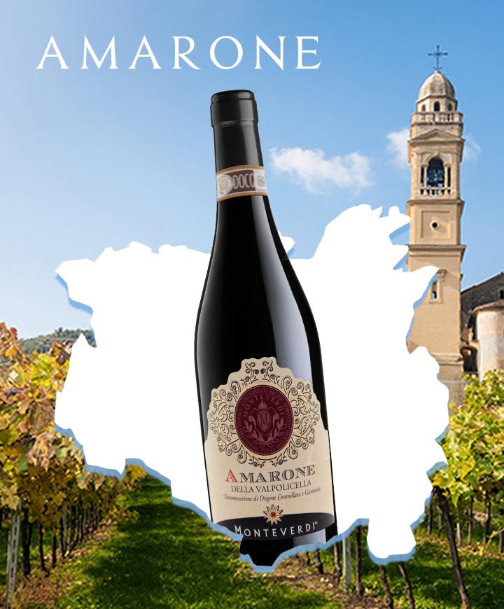 Amarone có màu đỏ đậm, với hương vị đặc trưng của trái cây sấy khô và rất thích hợp khi kết hợp với các món ăn thịt nướng, thịt thú rừng và pho-mat lâu năm.